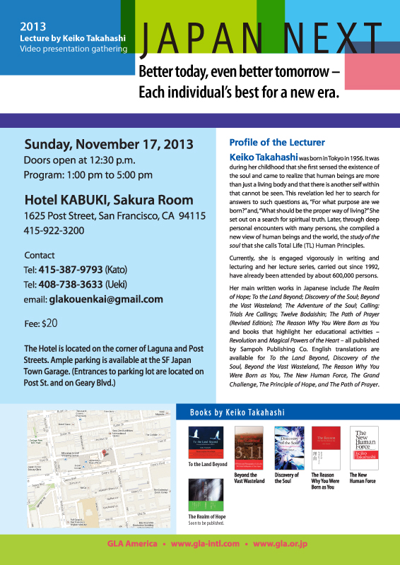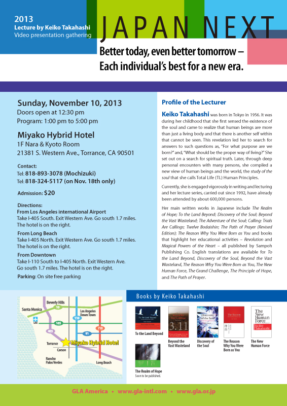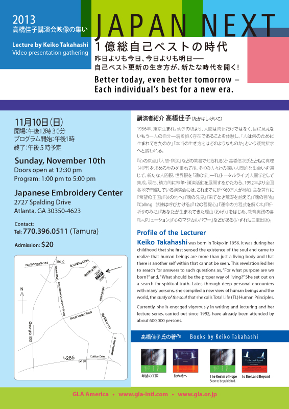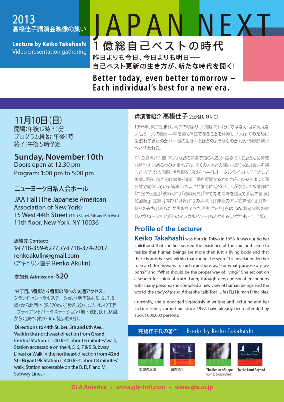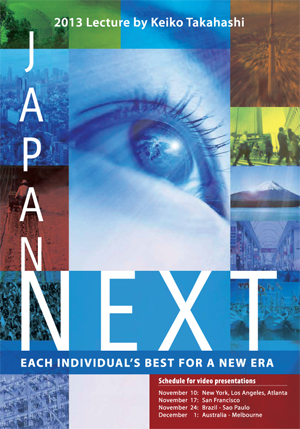 It is because we are confronting a pivotal moment in time that our society seeks a new philosophy, new theories, and a new way of living that will provide us with guidelines for the future. We believe that the Study of the Soul advocated by Keiko Takahashi provides us with a key to such guidelines and that the 2013 Lecture by Keiko Takahashi** provides us with an opportunity to inform society about the availability of this knowledge.