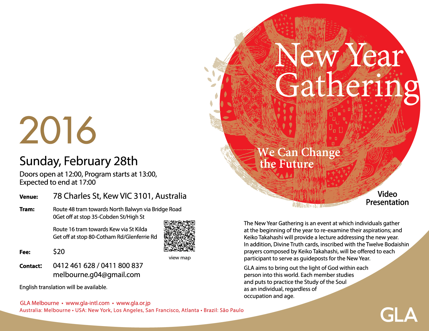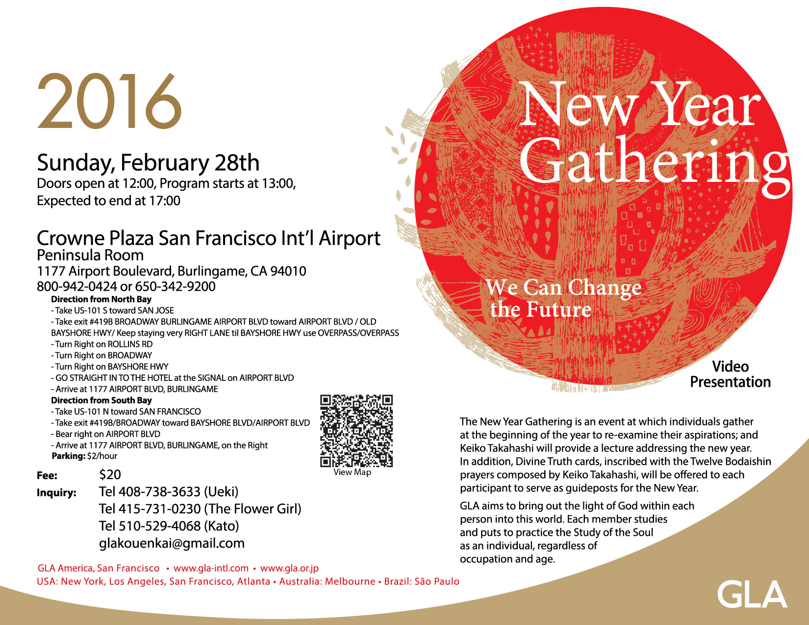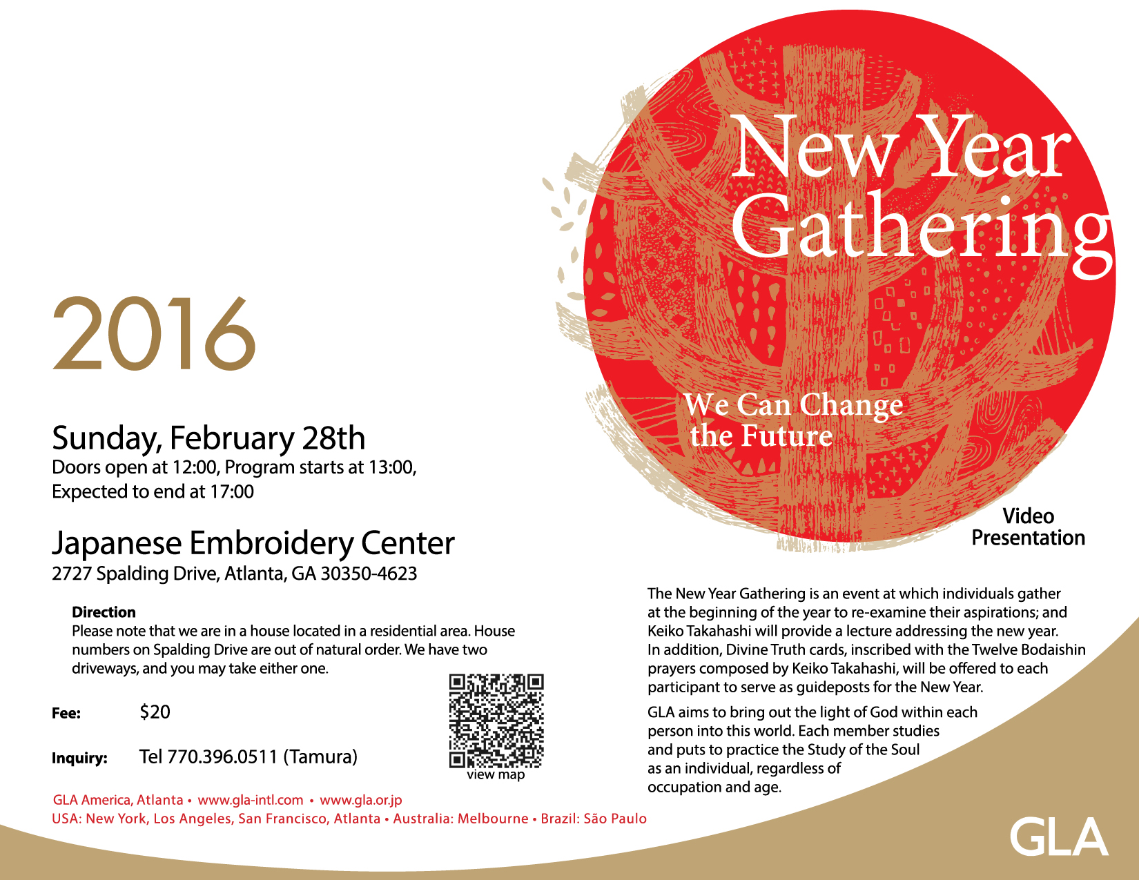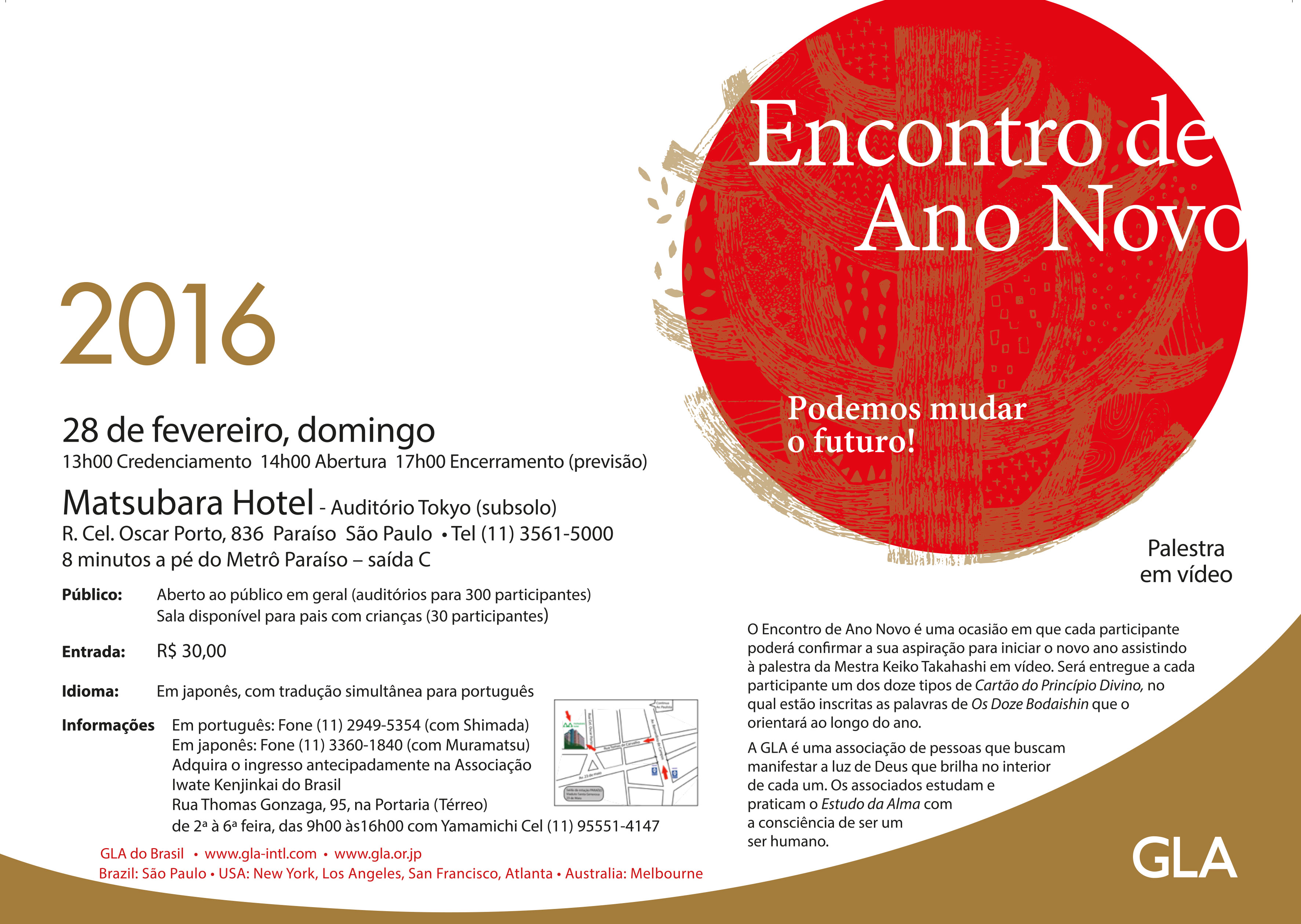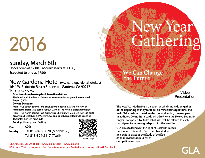 The New Year Gathering is an event at which individuals gather at the beginning of the year to re-examine their aspirations; and Keiko Takahashi will provide a lecture addressing the new year. In addition, Divine Truth cards, inscribed with the Twelve Bodaishin prayers composed by Keiko Takahashi, will be offered to each participant to serve as guideposts for the New Year.